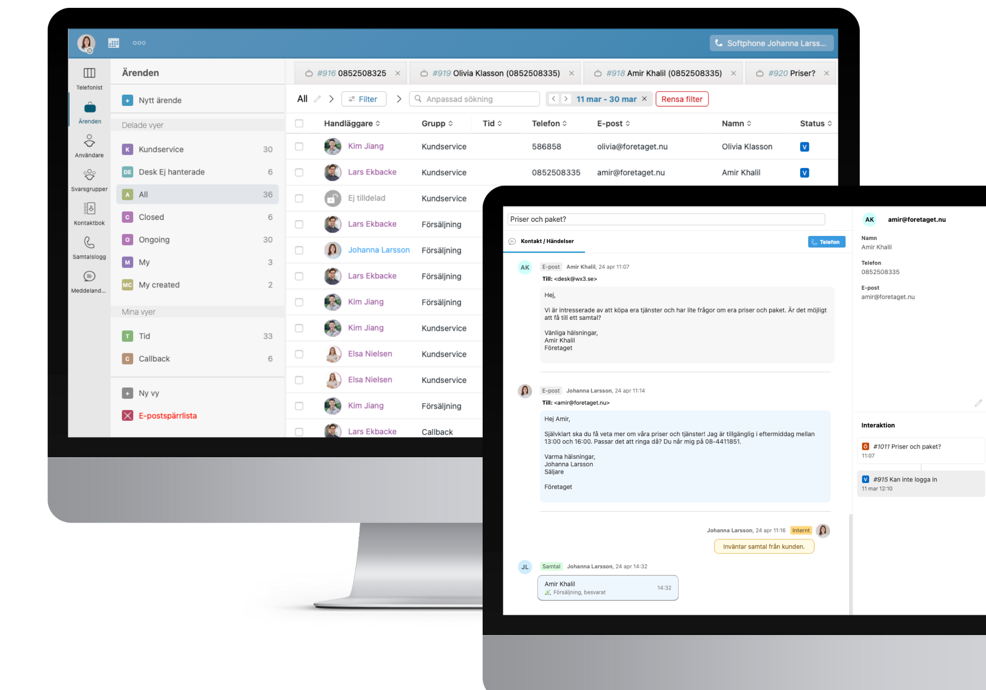 Kunddialog via telefon, e-post och SMS samlas i samma vy. Du följer allt i en tydlig tråd utan att växla mellan system eller inkorgar. Det ger bättre överblick och gör arbetet både snabbare och mer effektivt.